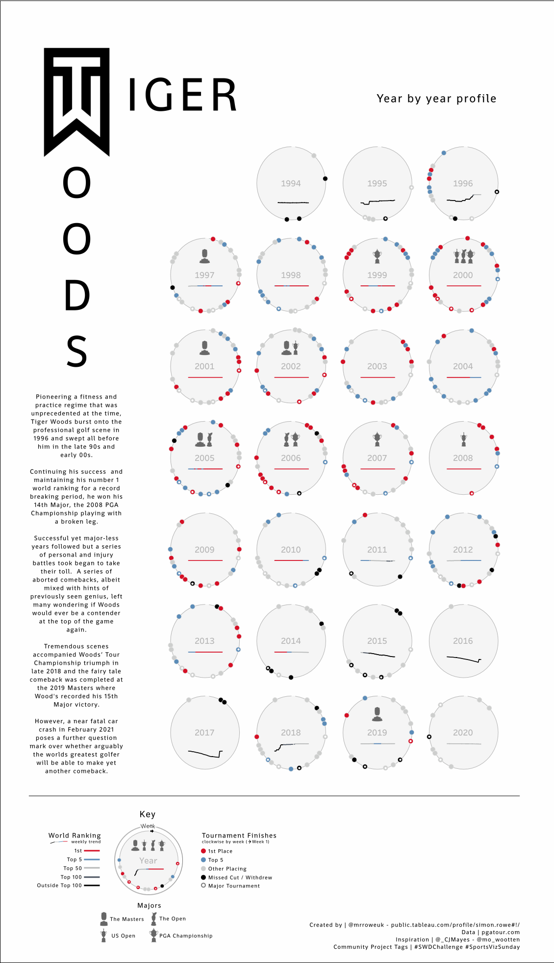 I first met Simon in 2018, when he attended a workshop I led in London where he lives. In Simon’s own words, this experience ignited his passion for data visualization (or data visualisation, as you’ll see it written from him!): “I’ve never attended a workshop before, or since, that has driven me to immediately take action and throw myself into something so earnestly.” What Simon threw himself into was the monthly SWD challenge (you’ll hear more about his experience in the forthcoming post), the Tableau community, and more recently, Sports Viz Sunday. Simon used these extracurricular activities to hone skills that he subsequently brought into the workplace.